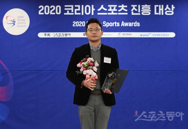 11일 서울 서대문구 동아일보 충정로 사옥에서 열린 ‘2020 코리아 스포츠 진흥대상(주최:스포츠동아 후원:문화체육관광부, 대한체육회, 국민체육진흥공단)’ 시상식에서 던롭스포츠코리아 김재윤 마케팅 팀장이 프로스포츠 부문 남자프로골프 대상을 수상하고 있다.