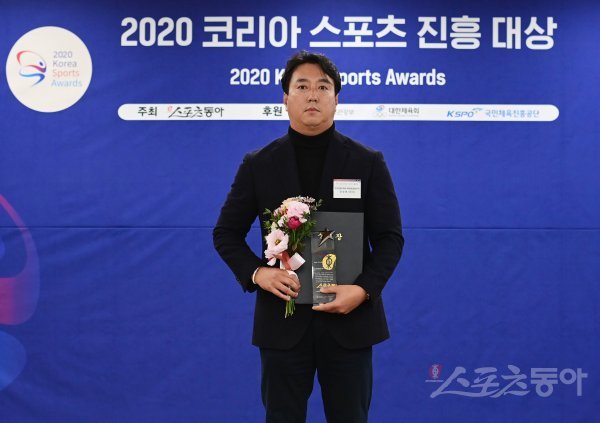 11일 서울 서대문구 동아일보 충정로 사옥에서 열린 ‘2020 코리아 스포츠 진흥대상(주최:스포츠동아 후원:문화체육관광부, 대한체육회, 국민체육진흥공단)’ 시상식에서 우리은행 위비 여자프로농구단 정장훈 사무국장이 프로스포츠 부문 여자프로농구 대상을 수상하고 있다.