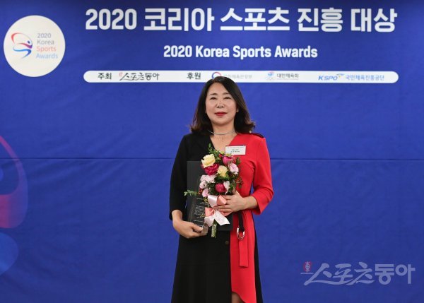 11일 서울 서대문구 동아일보 충정로 사옥에서 열린 ‘2020 코리아 스포츠 진흥대상(주최:스포츠동아 후원:문화체육관광부, 대한체육회, 국민체육진흥공단)’ 시상식에서 폭스나인 양수빈 대표가 리더국제 부문 글로벌리더 대상을 수상하고 있다.