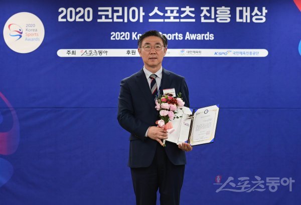 11일 서울 서대문구 동아일보 충정로 사옥에서 열린 ‘2020 코리아 스포츠 진흥대상(주최:스포츠동아 후원:문화체육관광부, 대한체육회, 국민체육진흥공단)’ 시상식에서 유엔 올로프팔메국제평화재단 아시아총괄 강경구 대표가 사회공헌·마케팅·스포츠의학 부문 사회공헌 대상을 수상하고 있다.