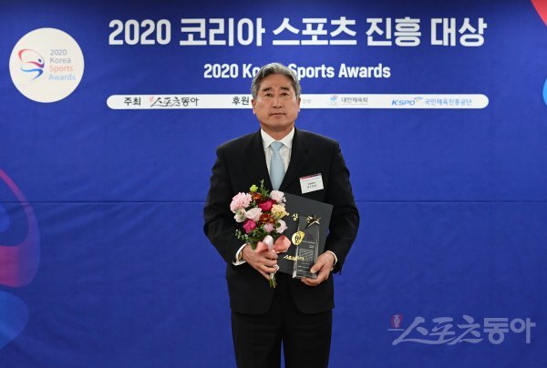 11일 서울 서대문구 동아일보 충정로 사옥에서 열린 ‘2020 코리아 스포츠 진흥대상(주최:스포츠동아 후원:문화체육관광부, 대한체육회, 국민체육진흥공단)’ 시상식에서 안양대학교 박노준 총장이 사회공헌·마케팅·스포츠의학 부문 특별 대상을 수상하고 있다.