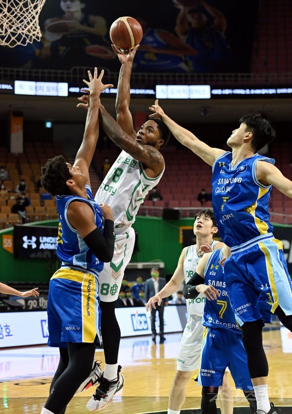 11일 서울 잠실실내체육관에서 열린 ‘2020-2021 현대모비스 프로농구’ 서울 삼성과 원주 DB의 경기에서 DB 존스가 삼성 힉스의 수비를 앞에 두고 슛을 쏘고 있다.