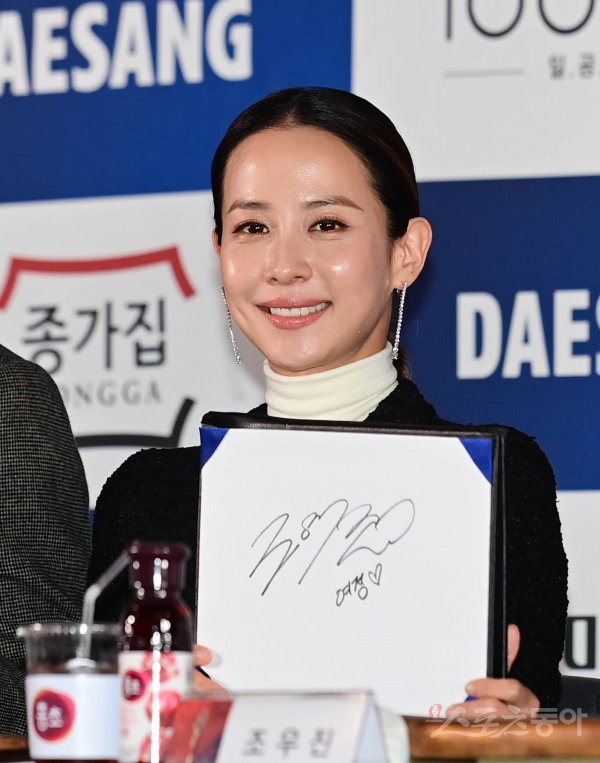 배우 조여정이 12일 서울 영등포구 CGV 여의도점에서 열린 ‘제41회 청룡영화상 핸드프린팅’에서 사인을 들고 포즈를 취하고 있다.