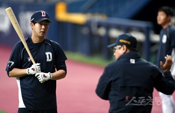 12일 서울 고척스카이돔에서 ‘2020 신한은행 SOL KBO리그’ 두산 베어스와 kt 위즈의 PO 3차전 경기가 열린다. 경기 전 두산 박건우가 김태형 감독의 타격 조언을 듣고 있다.