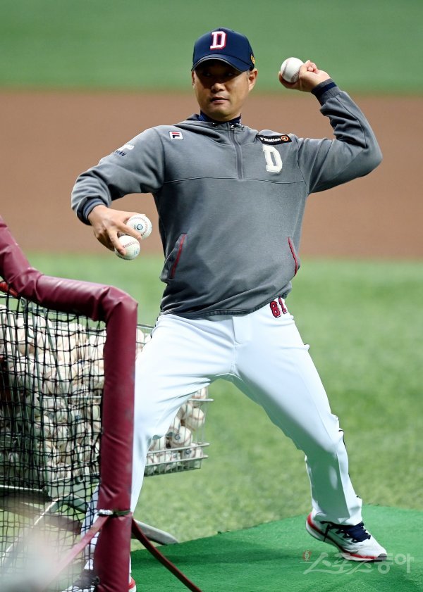 12일 서울 고척스카이돔에서 ‘2020 신한은행 SOL KBO리그’ 두산 베어스와 kt 위즈의 PO 3차전 경기가 열린다. 경기 전 두산 강동욱 코치가 배팅볼을 던지고 있다.