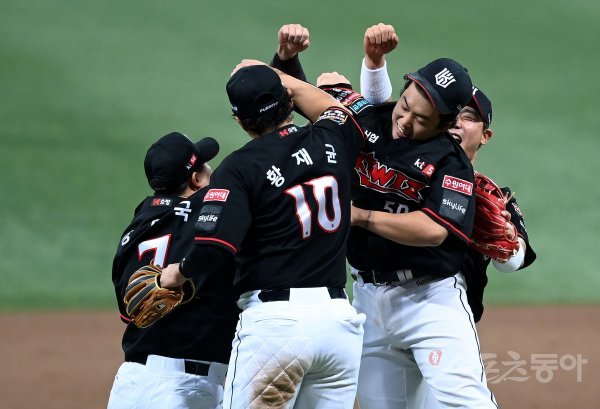kt가 두산에 5-2로 승리한 뒤 선수들이 그라운드에서 기쁨을 나누고 있다.