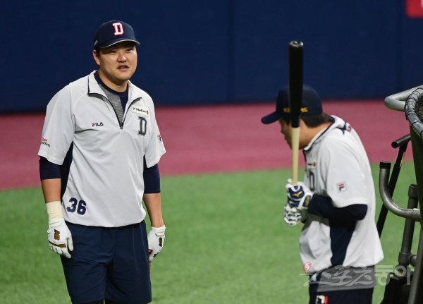13일 서울 고척스카이돔에서 ‘2020 신한은행 SOL KBO리그’ 플레이오프 4차전 두산 베어스와 KT 위즈의 경기가 열렸다. 경기 전 훈련에서 두산 오재일과 박세혁이 이야기를 하고 있다.