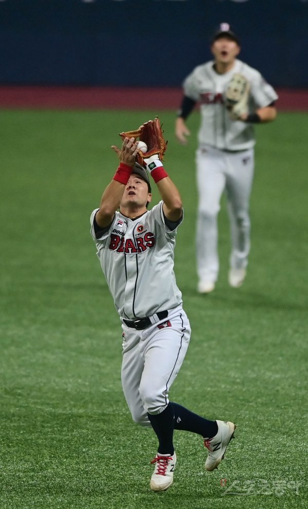 1회초 1사 2, 3루 KT 유한준의 뜬공 타구를 두산 2루수 최주환이 잡고 있다.