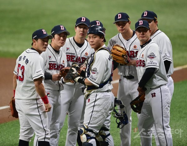 경기 시작에 앞서 두산 선수들이 관중석을 바라보고 있다.