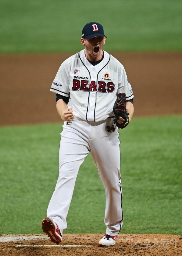 두산이 2-0으로 승리를 거둬 한국시리즈 진출을 확정 지은 뒤 플렉센이 포효하고 있다.