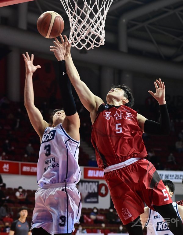 15일 경기도 안양실내체육관에서 열린 ‘2020-2021 현대모비스 프로농구’ 안양 KGC와 전주 KCC의 경기에서 KCC 이정현과 KGC 변준형이 리바운드 다툼을 하고 있다.