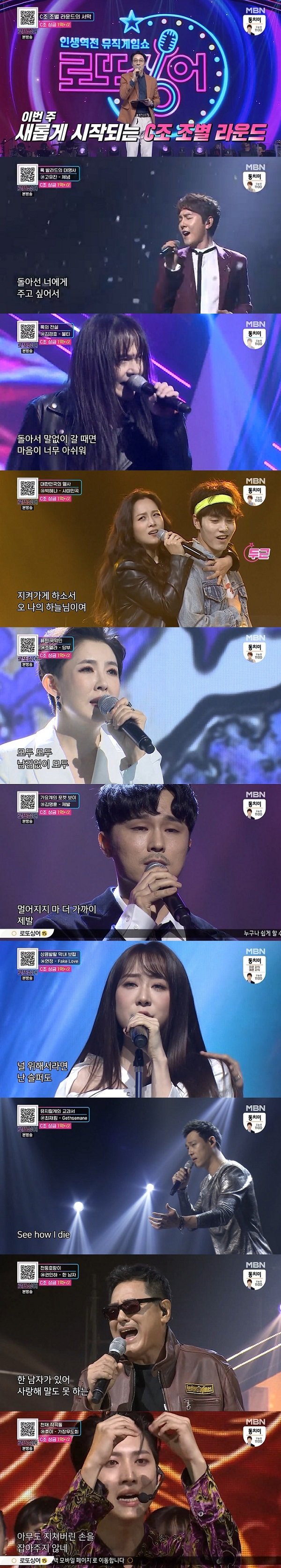 14일 방송된 MBN 예능프로그램 ‘인생역전 뮤직게임쇼 - 로또싱어’(이하 ‘로또싱어’/연출 유일용) 7회에서는 마지막 C조 조별 라운드 무대가 시작, 고유진, 김경호, 박혜나, 조엘라, 김명훈, 연정, 최재림, 권인하, 후이까지 다양한 장르의 싱어 9인의 열창이 그려지며 토요일 밤을 꽉 채웠다.
