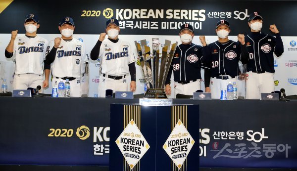 16일 서울 고척스카이돔에서 ‘2020 신한은행 SOL KBO리그’ NC 다이노스와 두산 베어스의 한국시리즈 미디어데이가 열렸다. NC 박민우, 양의지, 이동욱 감독과 두산 김태형 감독, 박세혁, 이영하가 우승트포리를 앞에 두고 기념촬영을 하고 있다.