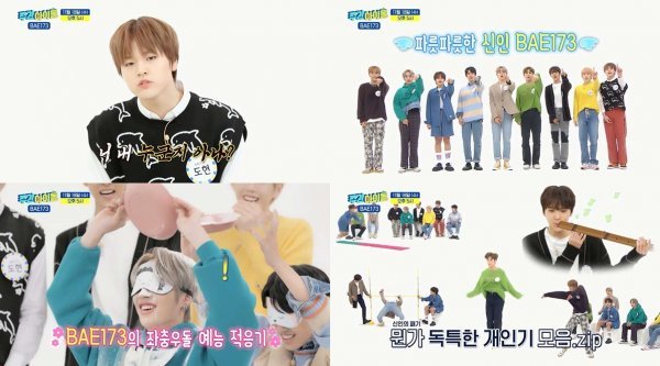 BAE173는 19일 정식 데뷔를 앞두고 ‘주간아이돌’에 등장했다. 신인 그룹 BAE173는 각 멤버들의 다양한 매력을 볼 수 있는 개인기 대방출 시간을 가졌다. BAE173는 개인기 스틸러로 유명한 2MC들과의 개인기 지키기 대결로 재미를 더했다.