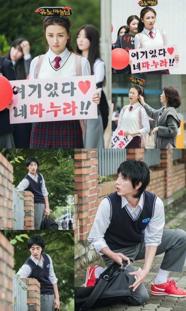 특히 그녀가 쓰고 있는 머리띠와 플랜카드 속 문구 또한 인상적이다. ‘유노마눌님’, ‘여기 있다 네 마누라’라는 문구에서부터 극 중 모성애 강한 육아 고수인 은정 캐릭터의 기운이 강하게 느껴지기 때문. 또 다른 스틸에서는 몰래 유노윤호를 보러 왔다가 엄마에게 딱 걸린 듯 귀를 잡힌 채 끌려 나오고 있는 박하선의 모습이 포착되어 있어 웃음을 자아낸다.