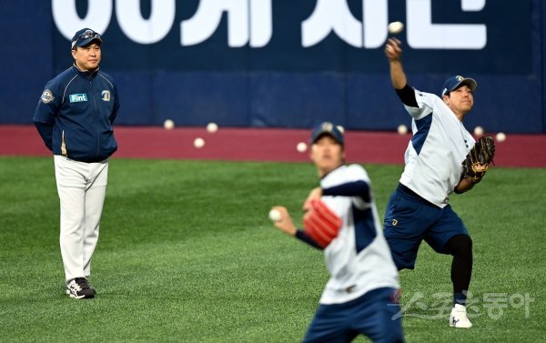 17일 서울 고척스카이돔에서 ‘2020 신한은행 SOL KBO리그’ NC 다이노스와 두산 베어스의 경기가 열린다. 경기 전 NC 이동욱 감독이 투수들의 훈련을 지켜보고 있다.
