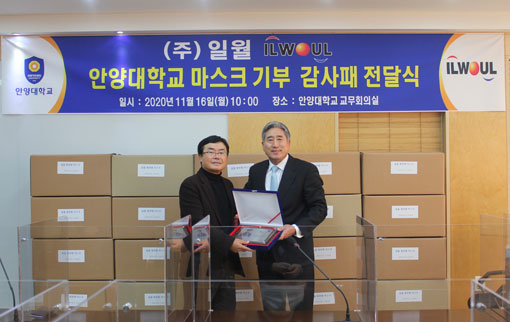 안양대(총장 박노준)가 16일 오전 10시 일우중앙도서관 5층 교무회의실에서 안양대 학생과 교직원을 위해 방역 마스크 50만 장을 쾌척한 (주)일월 이광모 회장에게 감사패를 전달했다.