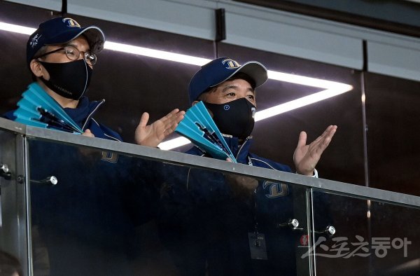 NC 김택진(오른쪽) 구단주가 응원을 펼치고 있다.