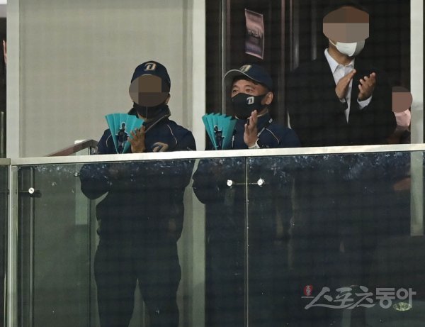 경기에 앞서 한국시리즈 공식 행사에서 김택진 구단주가 관중석에서 박수를 치고 있다.