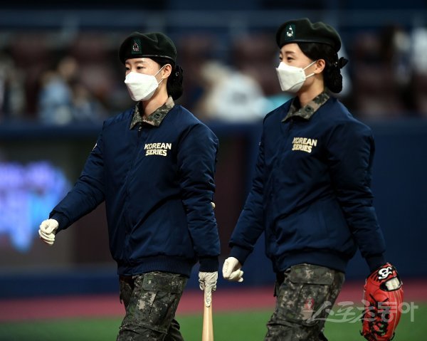 코로나19를 위해 헌신한 간호장교 신나은, 신다미 쌍둥이 자매가 시구, 시타를 마친 뒤 경기장을 빠져나가고 있다.