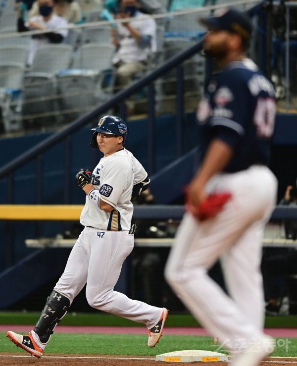 1회말 1사 3루 NC 나성범이 선취 1타점 우전 적시타를 쳐낸 뒤 1루에서 타구를 바라보고 있다.