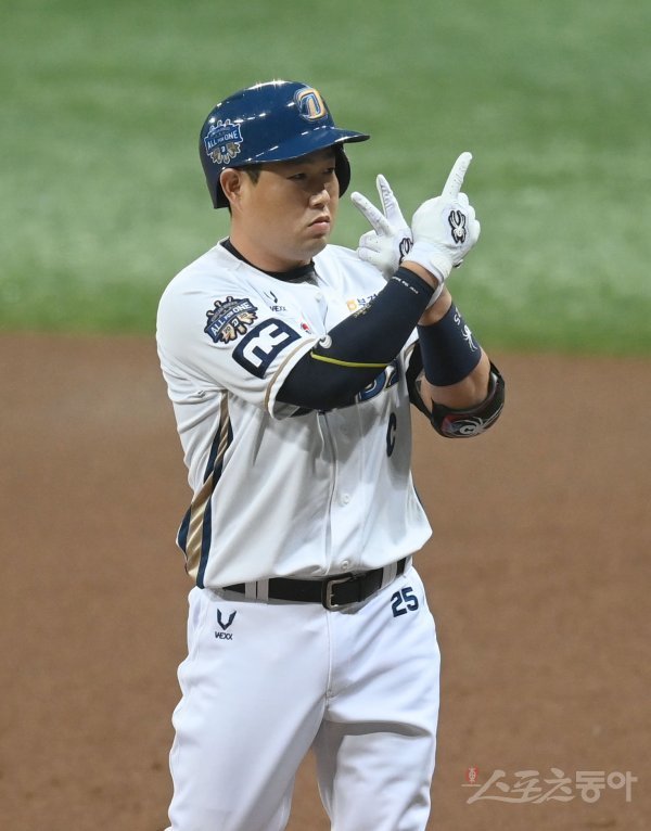 1회말 1사 1루 NC 양의지가 좌전 안타를 치고 1루에서 세리머니를 하고 있다.
