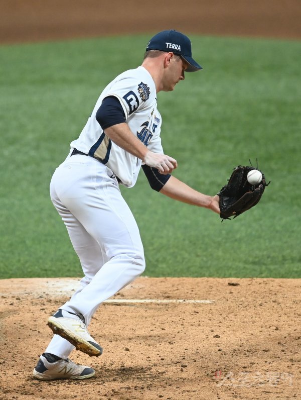 선발 투수로 등판한 NC 루친스키가 5회초 1사 만루 두산 페르난데스의 타구를 잡아 병살 처리하고 있다.