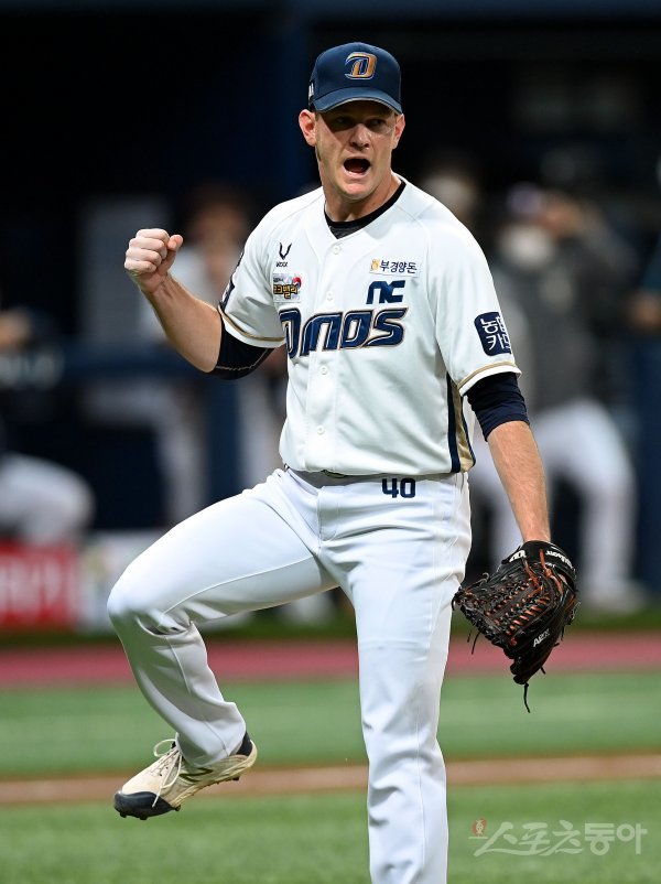 17일 서울 고척스카이돔에서 ‘2020 신한은행 SOL KBO리그’ NC 다이노스와 두산 베어스의 한국시리즈 1차전 경기가 열렸다. 5회초 1사 만루에서 두산 페르난데스를 병살 아웃시킨 NC 선발 루친스키가 포효하고 있다.