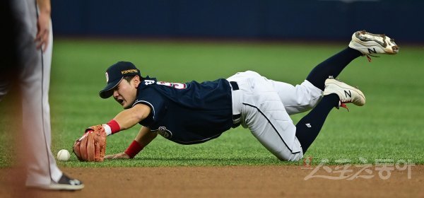 5회말 1사 NC 나성범의 내야 안타를 두산 최주환이 놓치고 있다.