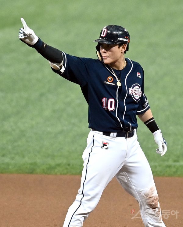 6회초 1사 1,2루 두산 박세혁이 1타점 중전 2루타를 치고 2루에서 기뻐하고 있다.