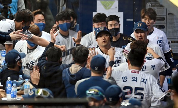 8회말 1사 3루 NC 박석민이 1타점 희생타를 치고 더그아웃에서 기뻐하고 있다.