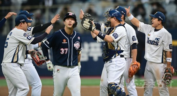 NC가 두산에 5-3으로 승리를 거둔 뒤 선수들이 기쁨을 나누고 있다.