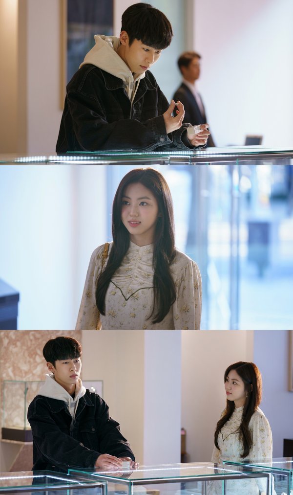 이어진 사진에는 선우준과 정가영의 흥미로운 만남도 포착됐다. 선우준을 알아보고 다가가는 정가영의 얼굴엔 반가움이 가득하다. 하지만 미소를 띤 정가영과 달리, 관심 없는 공허한 눈빛으로 무심하게 그를 대하는 선우준의 모습도 눈길을 끈다. 상반된 온도차를 보이는 두 남녀의 만남이 다이내믹한 구라라, 선우준 로맨스에 어떤 변수로 작용할지 이목이 집중된다. 또한, 갑작스럽게 등장한 그녀의 정체에도 궁금증이 모인다.