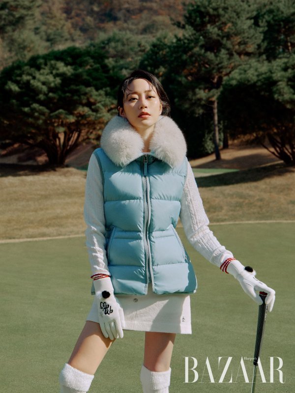 오후에는 무드를 바꿔 캐주얼 스타일의 르꼬끄골프 룩을 선보였다. 비니와 벨벳라이크 구스다운 점퍼, 그리고 조거팬츠를 함께 믹스해 필드에서도 주목받을 수 있는 스타일링을 완성한 것. 이 뿐만 아니라 포인트가 되어주는 패턴 점퍼에 플리츠 스커트를 더해 한층 더 패셔너블하고도 감각적인 룩도 연출했다. 이번 시즌 르꼬끄골프는 아우터부터 이너, 팬츠까지 스포티하면서도 스타일리시한 룩을 만나볼 수 있을 것으로 기대된다.