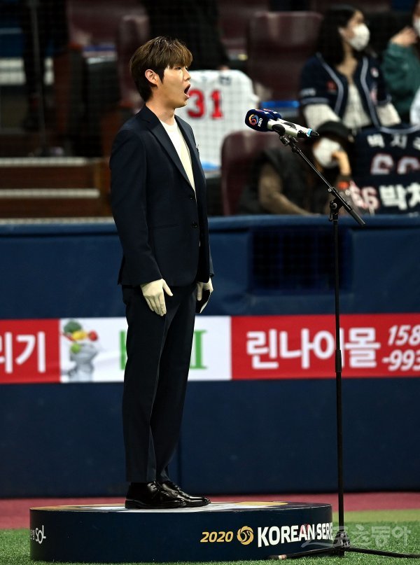 18일 서울 고척스카이돔에서 ‘2020 신한은행 SOL KBO리그’ NC 다이노스와 두산 베어스의 한국시리즈 2차전 경기가 열렸다. 가수 손태진이 애국가를 부르고 있다. 고척 | 김민성 기자 marineboy@donga.com
