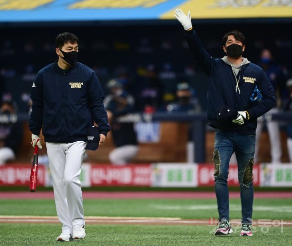 18일 서울 고척스카이돔에서 ‘2020 신한은행 SOL KBO리그’ 한국시리즈 2차전 NC 다이노스와 두산 베어스의 경기가 열렸다. 배우 하도권과 조한선이 시구와 시타를 맡아 그라운드에 입장하고 있다. 고척 | 주현희 기자 teth1147@donga.com