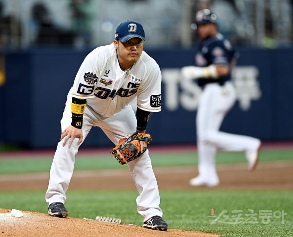 18일 서울 고척스카이돔에서 ‘2020 신한은행 SOL KBO리그’ NC 다이노스와 두산 베어스의 한국시리즈 2차전 경기가 열렸다. 2회초 1사 1, 2루에서 두산 박건우의 내야 안타 타구를 NC 박석민이 잡아 1루로 송구 실책을 범한 뒤 아쉬워하고 있다. 고척 | 김민성 기자 marineboy@donga.com