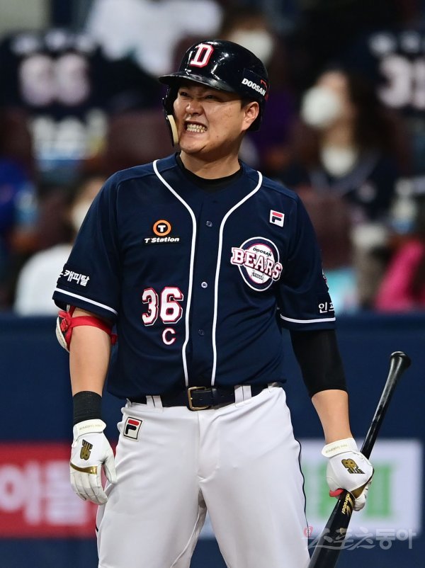 18일 서울 고척스카이돔에서 ‘2020 신한은행 SOL KBO리그’ 한국시리즈 2차전 NC 다이노스와 두산 베어스의 경기가 열렸다. 2회초 무사 1, 2루 두산 오재일이 번트를 실패한 뒤 아쉬워하고 있다. 고척 | 주현희 기자 teth1147@donga.com