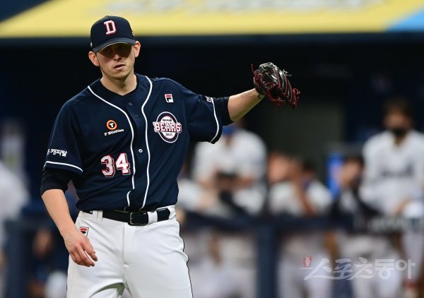 18일 서울 고척스카이돔에서 ‘2020 신한은행 SOL KBO리그’ 한국시리즈 2차전 NC 다이노스와 두산 베어스의 경기가 열렸다. 2회말 2사 만루 상황에서 두산 플렉센이 굳은 얼굴로 볼을 잡고 있다. 고척 | 주현희 기자 teth1147@donga.com