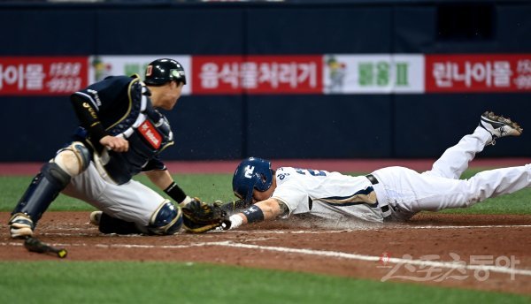 18일 서울 고척스카이돔에서 ‘2020 신한은행 SOL KBO리그’ NC 다이노스와 두산 베어스의 한국시리즈 2차전 경기가 열렸다. 4회말 1사 만루에서 NC 알테어의 플라이 아웃 때 3루 주자 양의지가 홈으로 파고 들었으나 두산 박세혁에게 태그 아웃되고 있다. NC에서 비디오판독을 요청했으나 아웃. 고척 | 김민성 기자 marineboy@donga.com