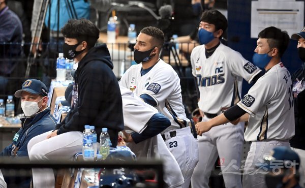 18일 서울 고척스카이돔에서 ‘2020 신한은행 SOL KBO 리그’ 포스트시즌 한국시리즈 2차전 두산 베어스와 NC 다이노스의 중립 경기가 열렸다. 1차전에서 마스크 착용 의무 규정 위반으로 벌금 20만을 받은 NC 알테어가 더그아웃에서 마스크를 착용하고 경기를 바라보고 있다. 고척 | 김종원 기자 won@donga.com