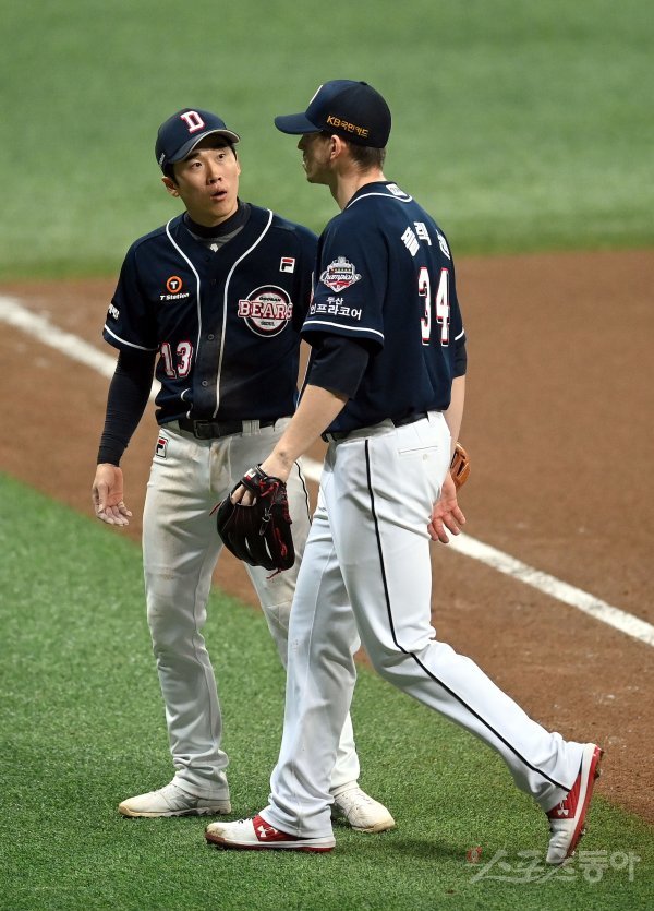 18일 서울 고척스카이돔에서 ‘2020 신한은행 SOL KBO 리그’ 포스트시즌 한국시리즈 2차전 두산 베어스와 NC 다이노스의 중립 경기가 열렸다. 6회말 1사 2루 NC 박석민이 투수 맞고 1루수 직선타로 아웃된 후 두산 허경민이 플렉센의 상태를 살피고 있다. 고척 | 김종원 기자 won@donga.com
