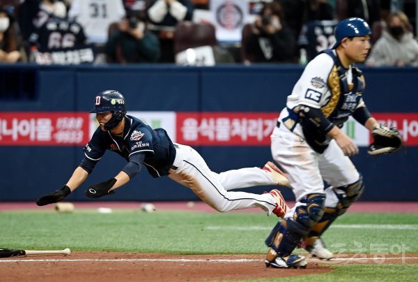 18일 서울 고척스카이돔에서 ‘2020 신한은행 SOL KBO리그’ NC 다이노스와 두산 베어스의 한국시리즈 2차전 경기가 열렸다. 8회초 2사 2루에서 두산 김재호의 1타점 적시타 때 2루 대주자 이유찬이 득점에 성공하고 있다. 고척 | 김민성 기자 marineboy@donga.com