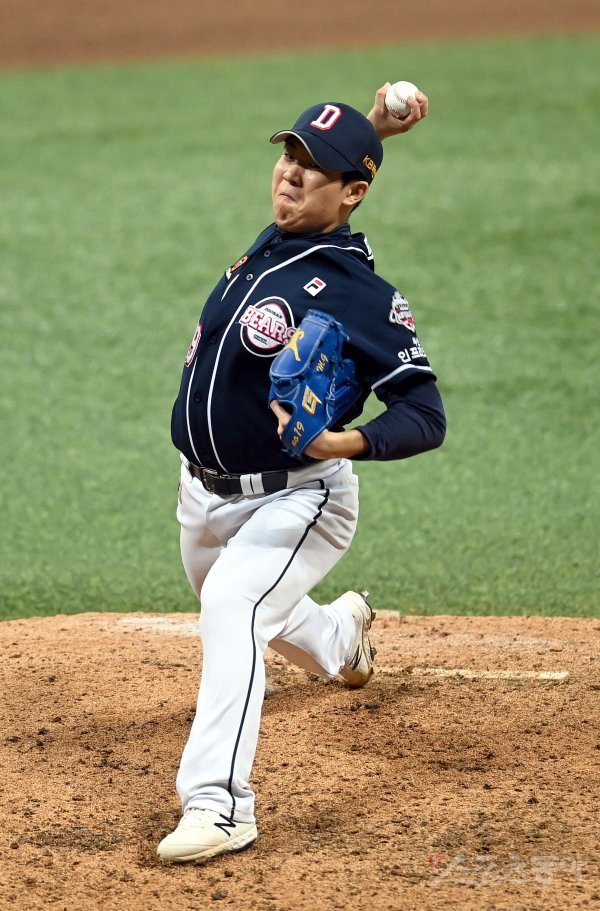 18일 서울 고척스카이돔에서 ‘2020 신한은행 SOL KBO 리그’ 포스트시즌 한국시리즈 2차전 두산 베어스와 NC 다이노스의 중립 경기가 열렸다. 9회말 1사 1,2루 상황에서 등판한 두산 김민규가 역투하고 있다. 고척 | 김종원 기자 won@donga.com