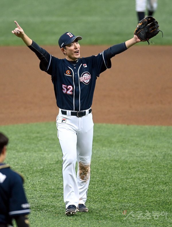 18일 서울 고척스카이돔에서 ‘2020 신한은행 SOL KBO 리그’ 포스트시즌 한국시리즈 2차전 두산 베어스와 NC 다이노스의 중립 경기가 열렸다. 5-4 승리를 거둔 후 두산 김재호가 기뻐하고 있다. 고척 | 김종원 기자 won@donga.com