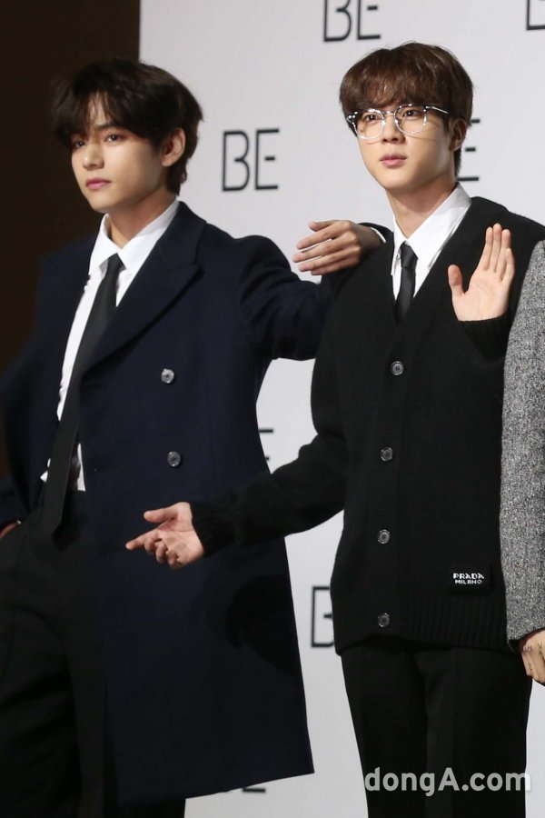 그룹 방탄소년단의 뷔(왼쪽)과 진이 20일 오전 서울 동대문디자인플라자에서 열린 새 앨범 \'BE (Deluxe Edition)\' 발매 글로벌 기자간담회에 참석해 포토타임을 갖고 있다.