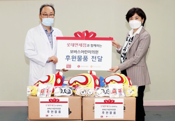 롯데면세점(대표이사 이갑)은 19일 롯데의료재단 보바스어린이의원과 함께 어린이 환우를 위한 희망나눔선물 전달식을 진행했다. 경기도 분당에 위치한 보바스기념병원에서 열린 행사에는 이상진 롯데면세점 마케팅부문장과 윤연중 보바스어린이의원 원장이 참석했다.