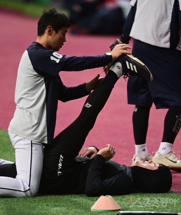 20일 서울 고척스카이돔에서 ‘2020 신한은행 SOL KBO리그’ 한국시리즈 3차전 두산 베어스와 NC 다이노스의 경기가 열린다. 경기 전 훈련에서 두산 김재호가 다리를 풀고 있다.