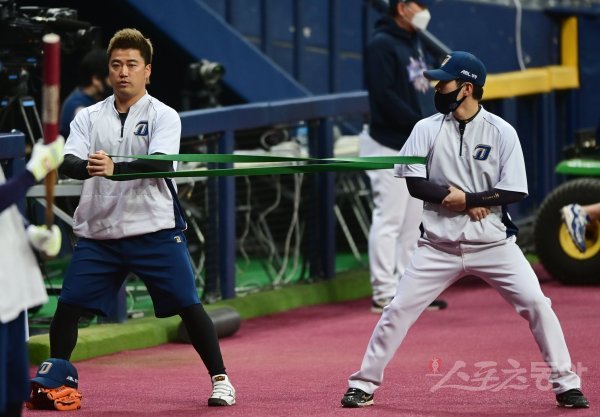 20일 서울 고척스카이돔에서 ‘2020 신한은행 SOL KBO리그’ 한국시리즈 3차전 두산 베어스와 NC 다이노스의 경기가 열린다. 경기 전 훈련에서 NC 박석민이 몸을 풀고 있다.