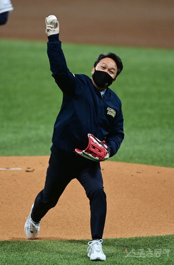 20일 서울 고척스카이돔에서 ‘2020 신한은행 SOL KBO리그’ 한국시리즈 3차전 두산 베어스와 NC 다이노스의 경기가 열렸다. 신한은행 진옥동 은행장이 시구를 하고 있다. 고척 | 주현희 기자 teth1147@donga.com
